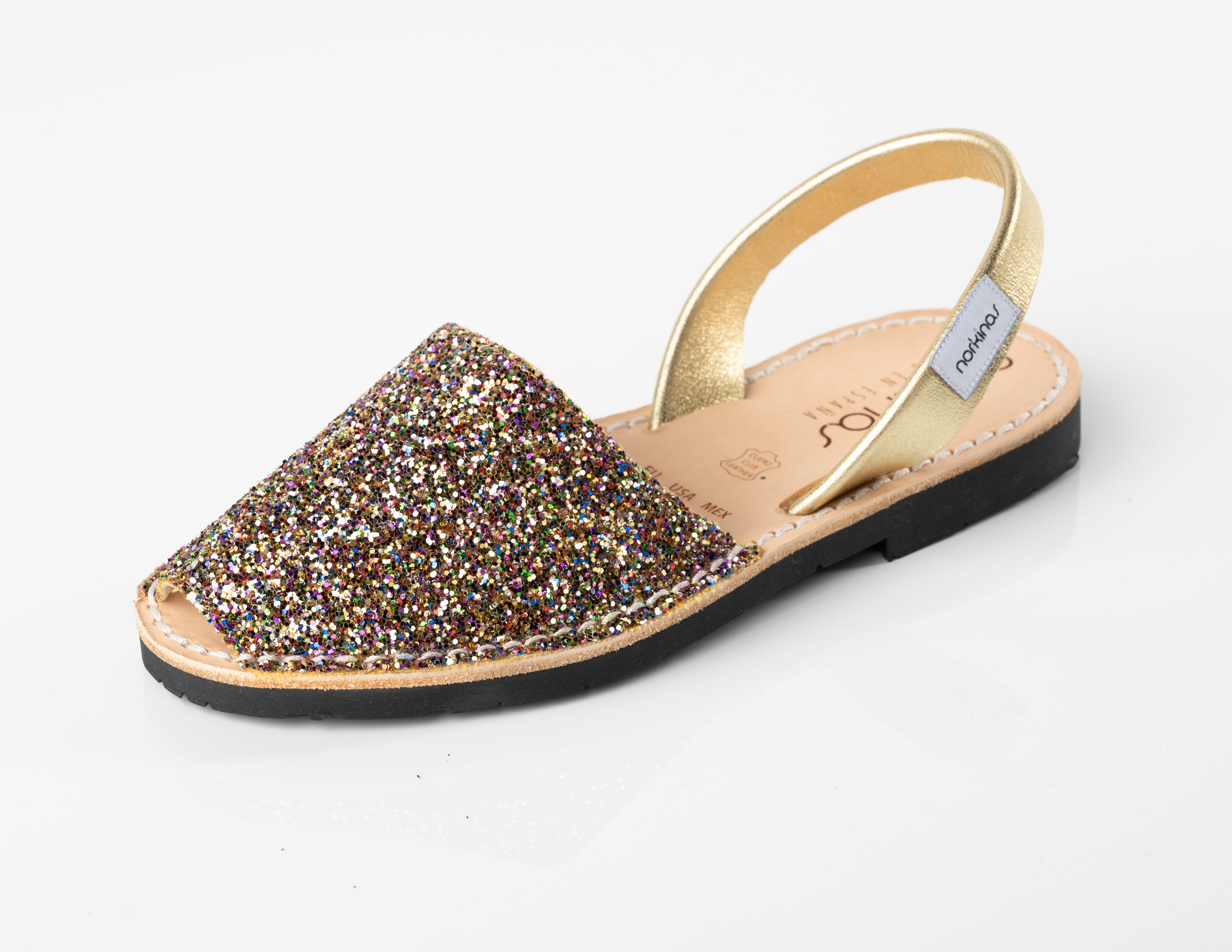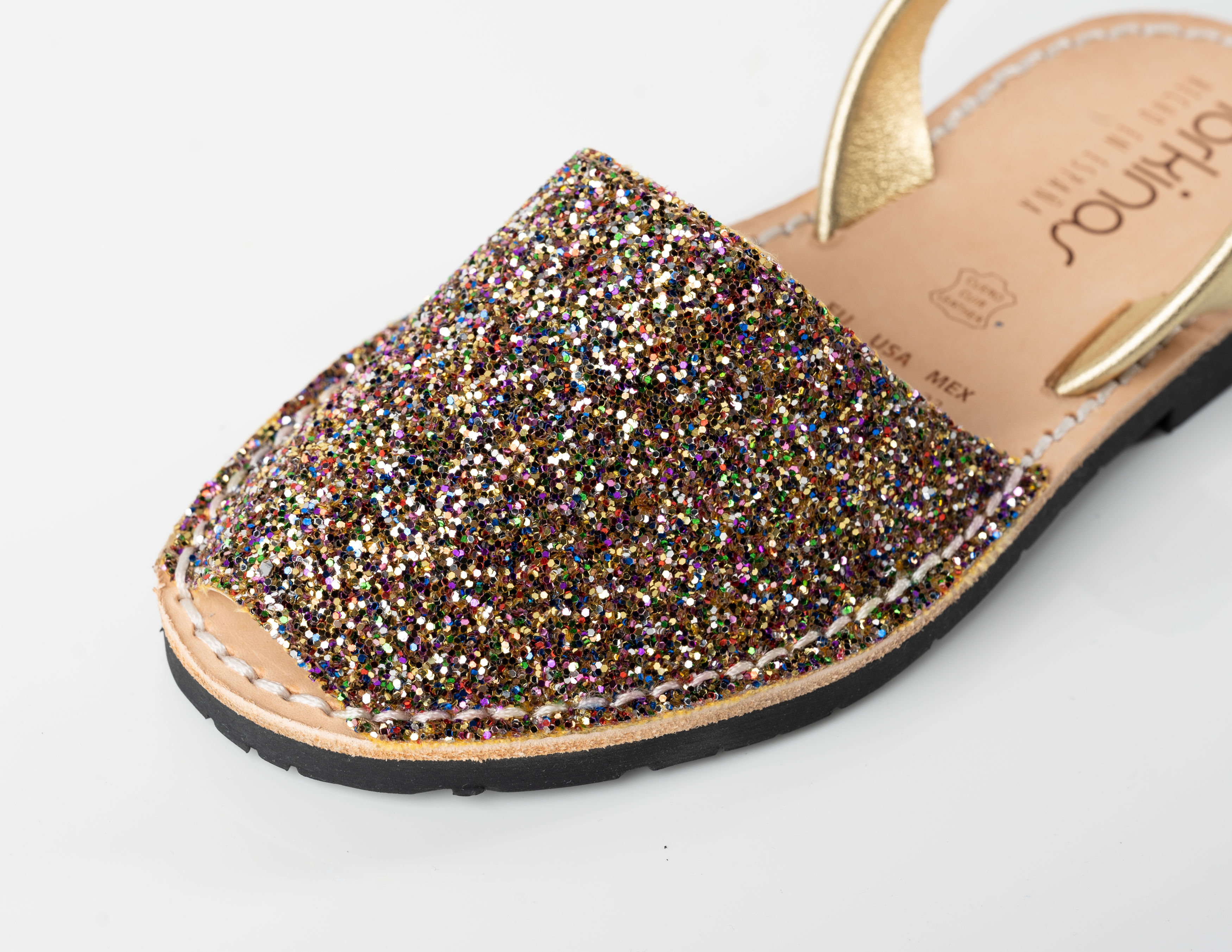 100% Escarcha/Glitter leather. Multicolored, glitter avarcas with champagne gold, metallic leather backstrap. Black recycled tyre sole. Authentically made in Spain. *Escarcha/glitter leather has an elegant, rich sparkle from every angle. Use everyday to enhance any outfit or for semi-formal ocassions. Cleans with a dry cloth only.