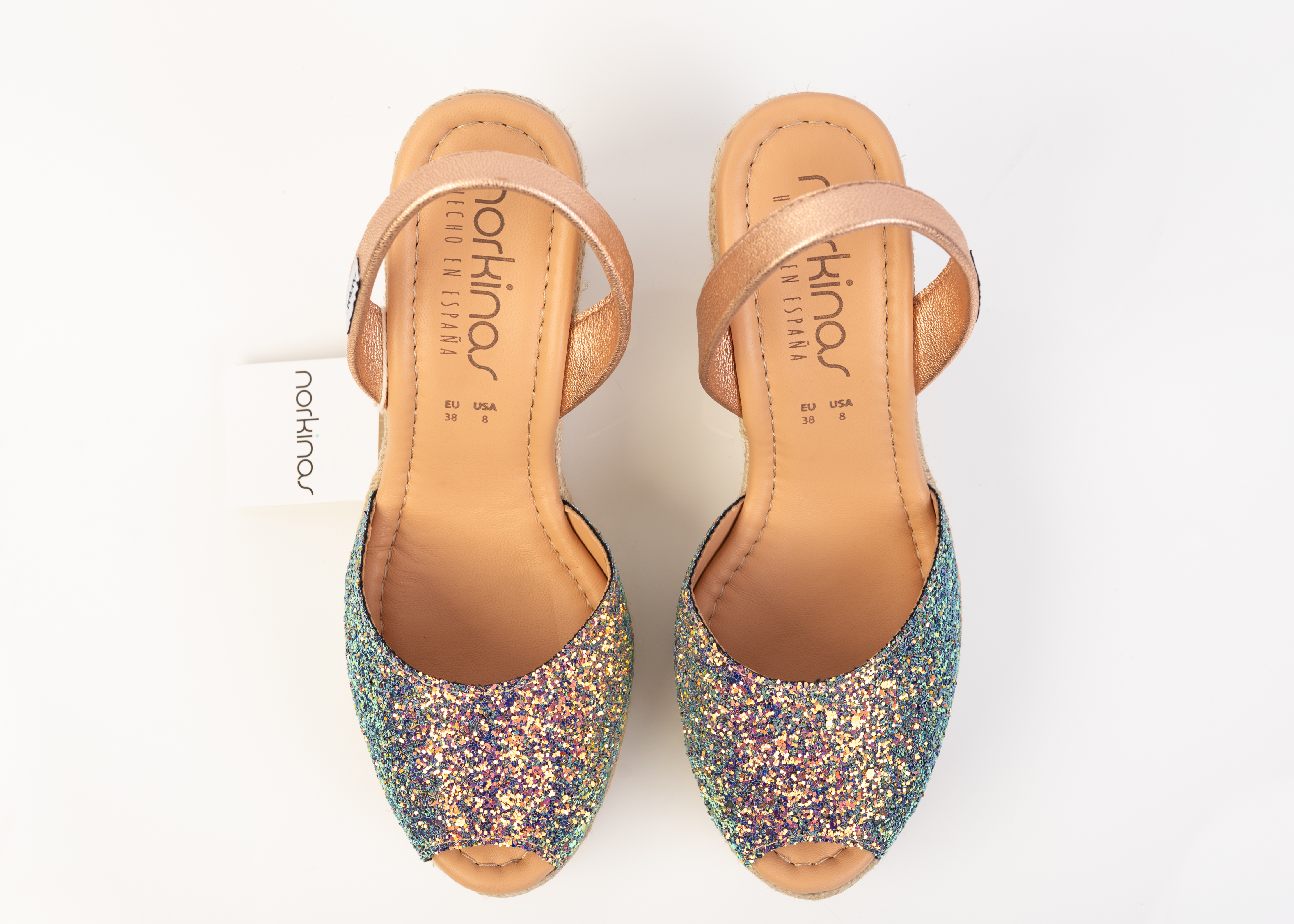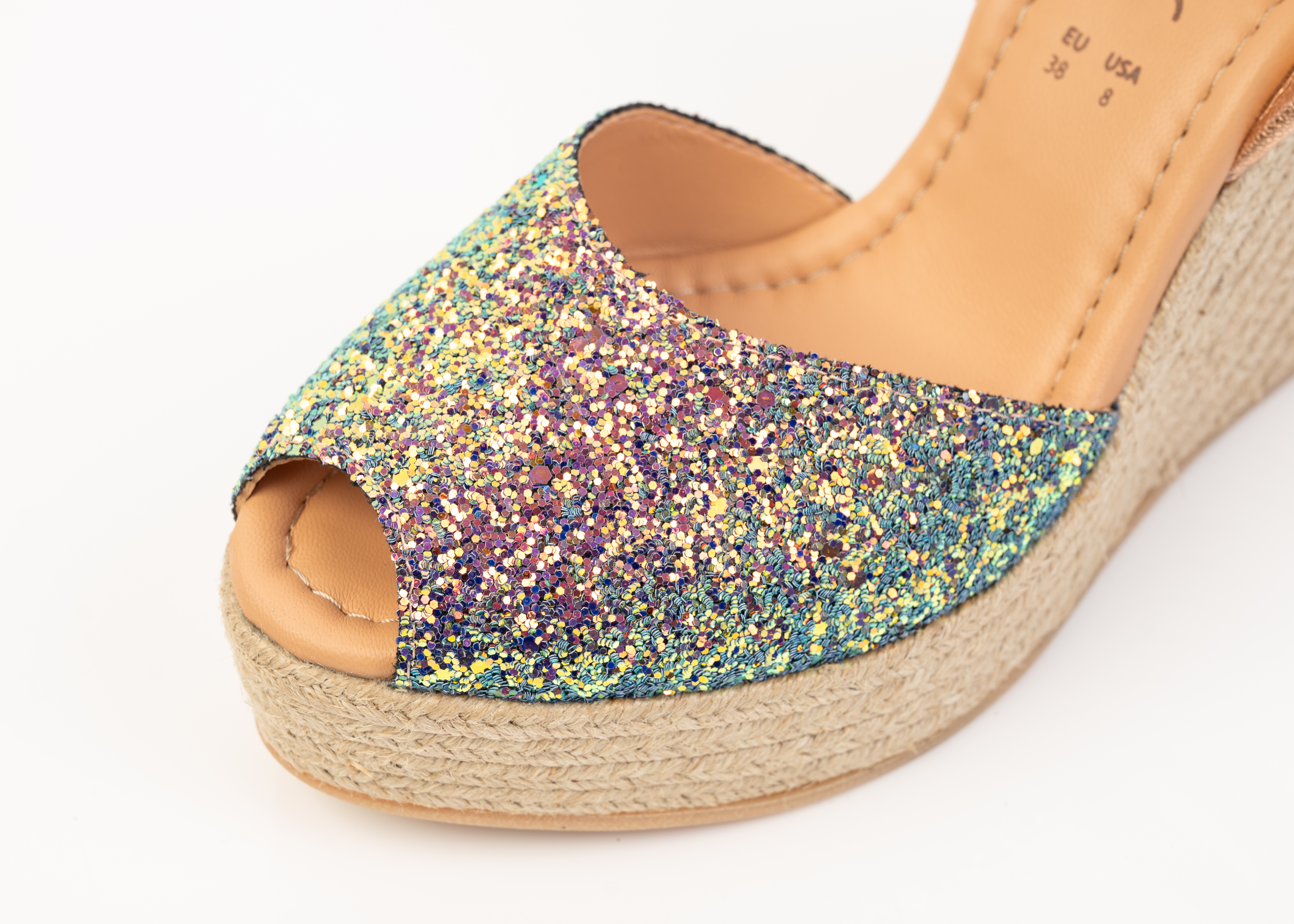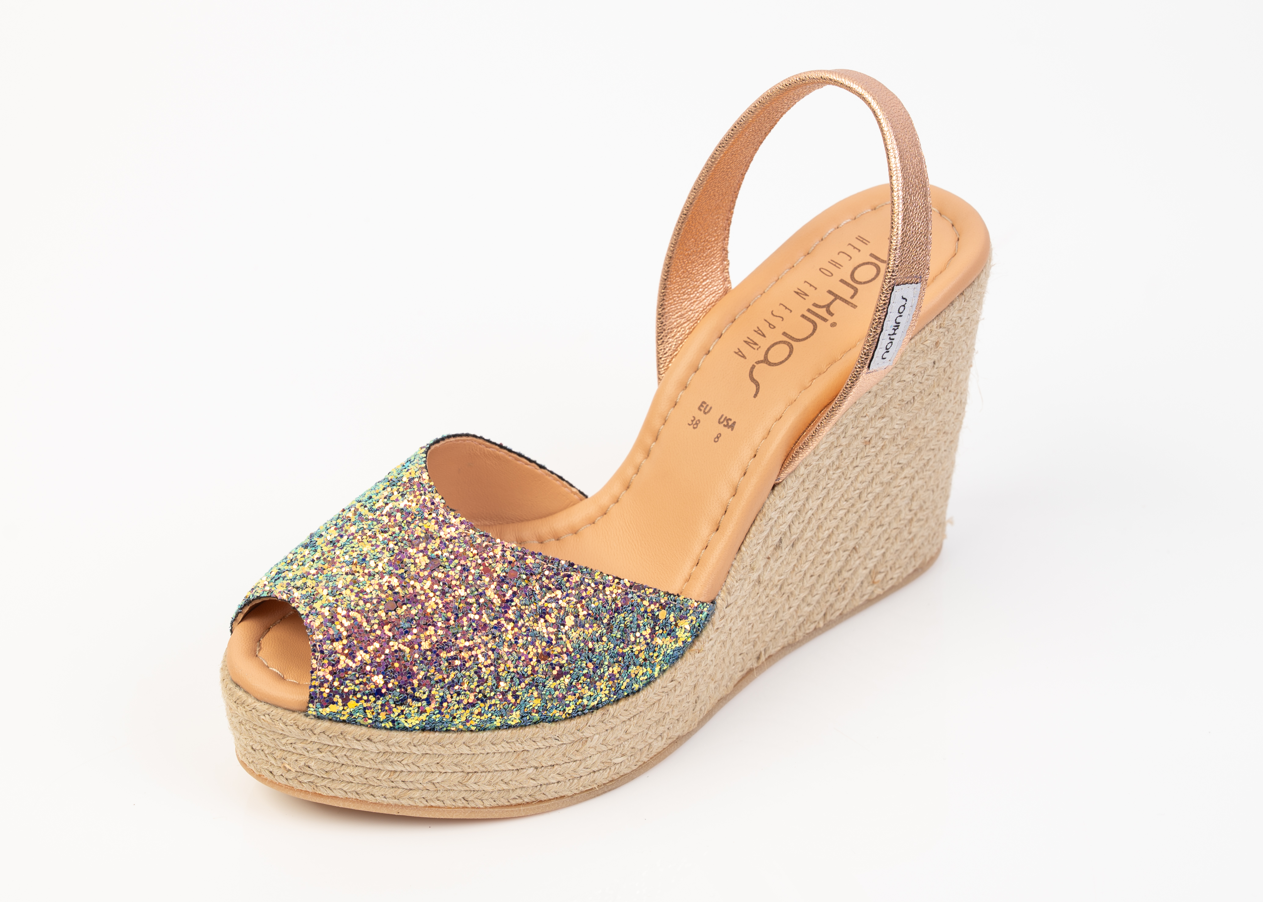 100% Escarcha leather, slingback wedge. 4-inch meticulously woven, espadrille heel. Perfectly balanced platform. Metal Kid Salmon backstrap. Non-skid rubber outer soles. Handcrafted by artisans in Spain.